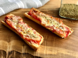 - Primero cortamos el pan baguette en 4 trozos, colocamos salsa pomodoro, el queso, el pollo y las verduritas cortadas.