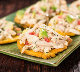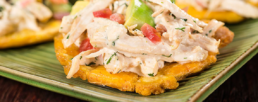- ¡Listo! Ahora serví el pollo sobre los patacones de plátano verde.